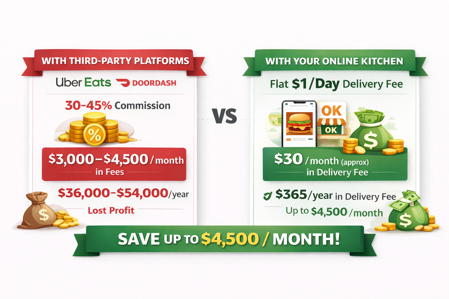 If your restaurant earns $10,000 per month on third-party platforms like Uber Eats, DoorDash, or Grubhub, you could be paying $3,000–$4,500 in monthly fees — totaling $36,000–$54,000 per year.